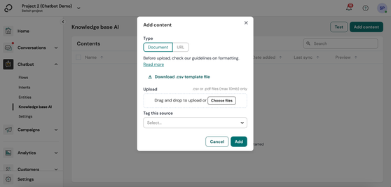 Zunächst einmal muss dein Bot auf deine Inhalte zugreifen können. Dazu musst Du deinen Bot Inhalte hinzufügen, die deine Knowledge Base bilden werden.