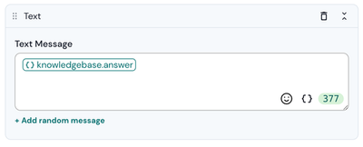 - Füge eine Textnachricht hinzu, die die Variable enthält, in der Du die AI-Antwort der Knowledge Base speichern möchtest. Standardmäßig ist dies {knowledgebase.answer}