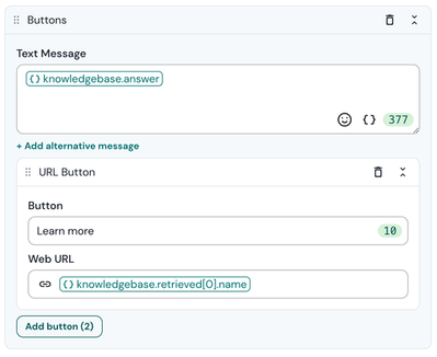 - Füge einen Button hinzu, die die folgende Variable anzeigt: knowledgebase.retrieved[0].name. In dieser Variable bedeutet name, dass wir die URL erfassen, [0] bedeutet, dass wir dies für das erste Element des abgerufenen Arrays tun. Deine Bot-Meldung sollte ähnlich wie diese aussehen: